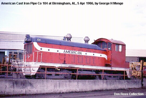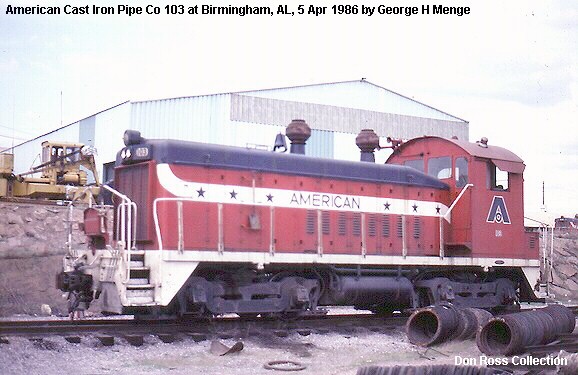 ![]() American Cast Iron Pipe SW1200 #103(2nd), Birmingham AL 1986, George H Menge-DR |
