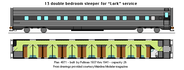 This is a single accommodation car, which bucks the trend in passenger car design. They have a limited capacity: 18 in single roomettes as compared to a typical 25 on most cars. As such, this has proven one of the less successful designs with only a few dozen produced. They are found on a few of the premiere trains including the "20th Century Limited", the "Broadway Limited" and The "Lark", and will no doubt be bumped to secondary trains after the war.