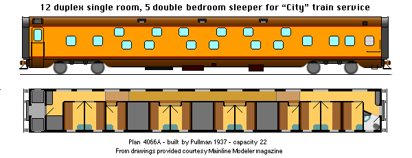 Typical of prewar Pullmans, these cars have a single vestibule, a public restroom at one end, and more locker space than some. They are used on the "Broadway Limited", the "20th Century Limited", through service on the Overland Route, and on the Southern Pacific "Lark".