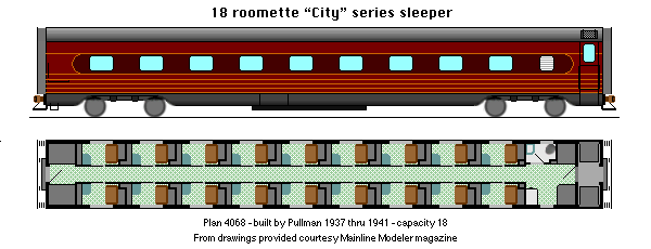 With the "City" series cars, the new "roomettes" (a room accommodation that fits like a glove) has graduated from the Motor Trains into the big time of mainstream railroading. This is a distinctly low-end room car designed for single travelers. On some railroads, one of the roomettes in the center of the car is exchanged for an open section for the Porter. So references to 17 roomette and 18 roomette are, in fact, the same car.