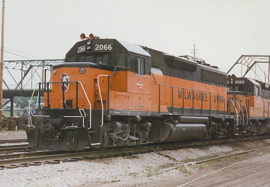 Milwaukee Road GP40 #2066, Kansas City KS 1985, w/Hiawatha emblem, blt 1968 cn34143 Doug Kroll |